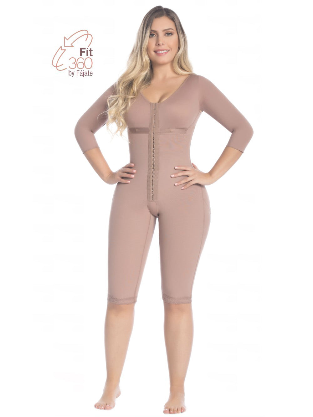 Faja completa de color beige, sin costuras, con manga larga y perneras de corte alto. Ofrece alta compresión gracias a su material Powernet y forro interno en lycra fría, proporcionando soporte, control abdominal y comodidad durante el uso diario y postoperatorio. El cierre perianal completo con cremallera facilita la ida al baño sin complicaciones. Su diseño con tres niveles de corchetes en el abdomen permite un ajuste progresivo para reducir medidas y adaptarse a cada etapa de recuperación. La tecnología Fit 360º realza los glúteos de manera natural, ayudando a moldear la figura y mejorar la postura después de procedimientos como liposucción o BBL.