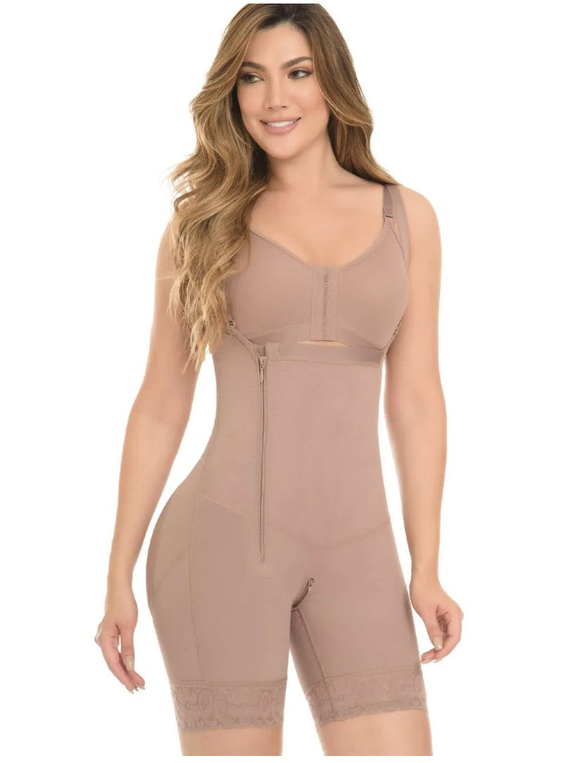 La faja reloj de arena cachetera es una prenda de alta compresión en color beige, diseñada para moldear el cuerpo completo y brindar soporte en el abdomen, cintura y caderas. Está hecha de lycra y Powernet, materiales que ayudan a la recuperación postquirúrgica, postparto o para uso diario. Sus tirantes finos y ajustables ofrecen comodidad, mientras que el cierre perianal completo facilita ir al baño sin complicaciones. Incluye glúteos acolchados con efecto ultra realce, ideal para después de lipotransferencias, pero no es apta para BBL. El cierre lateral la hace perfecta para quienes han pasado por cesárea o abdominoplastia, protegiendo la zona de la cicatriz. Cuenta con tecnología Viveltex Protect, que libera vitaminas y extractos naturales para cuidar la piel y acelerar la regeneración.