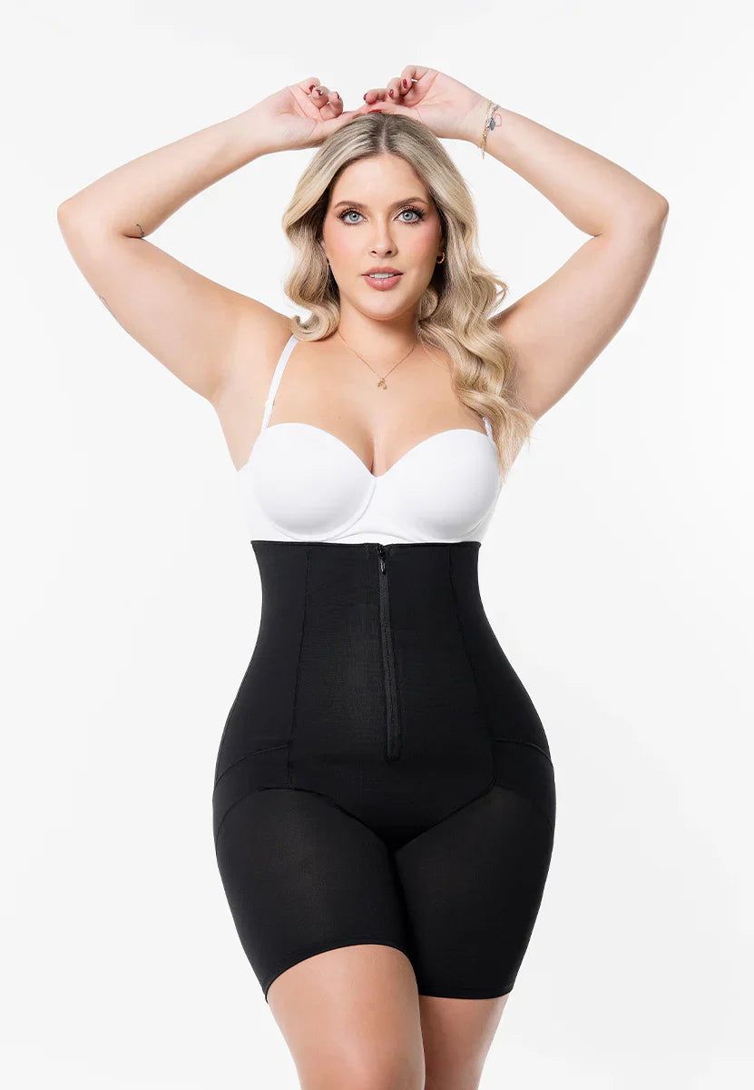 Faja post quirúrgica y reductora de talle alto en color negro, perfecta para moldear la silueta y brindar soporte en el abdomen, caderas y piernas. Su diseño sin tirantes y el cierre frontal con broches internos aseguran un ajuste firme e invisible bajo la ropa. El elástico siliconado en la cintura evita que la prenda se deslice, mientras que la banda especial en los glúteos realza la figura de forma natural. Fabricada en powernet suave y resistente, se adapta como una segunda piel ofreciendo comodidad todo el día. La apertura perineal práctica facilita su uso diario, ideal para recuperación postparto o procesos postquirúrgicos.